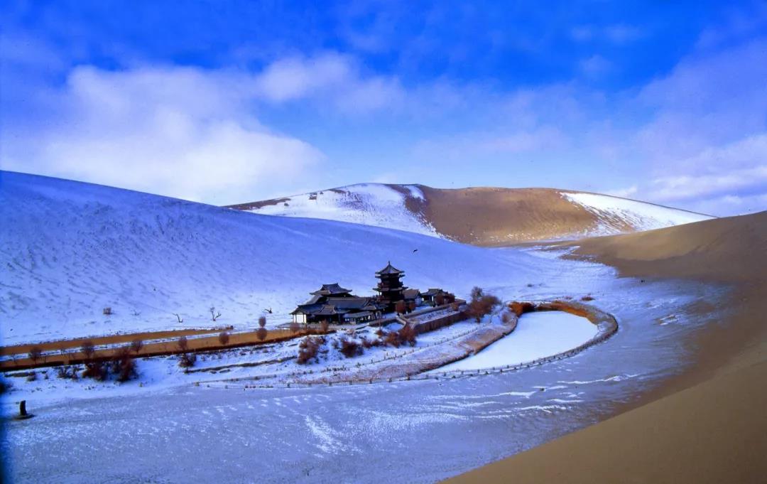 皑皑白雪,覆盖在黄沙之上,将沙漠变得柔软而有线条,雪与泉的结合,美的如诗如画。via :鸣沙山月牙泉