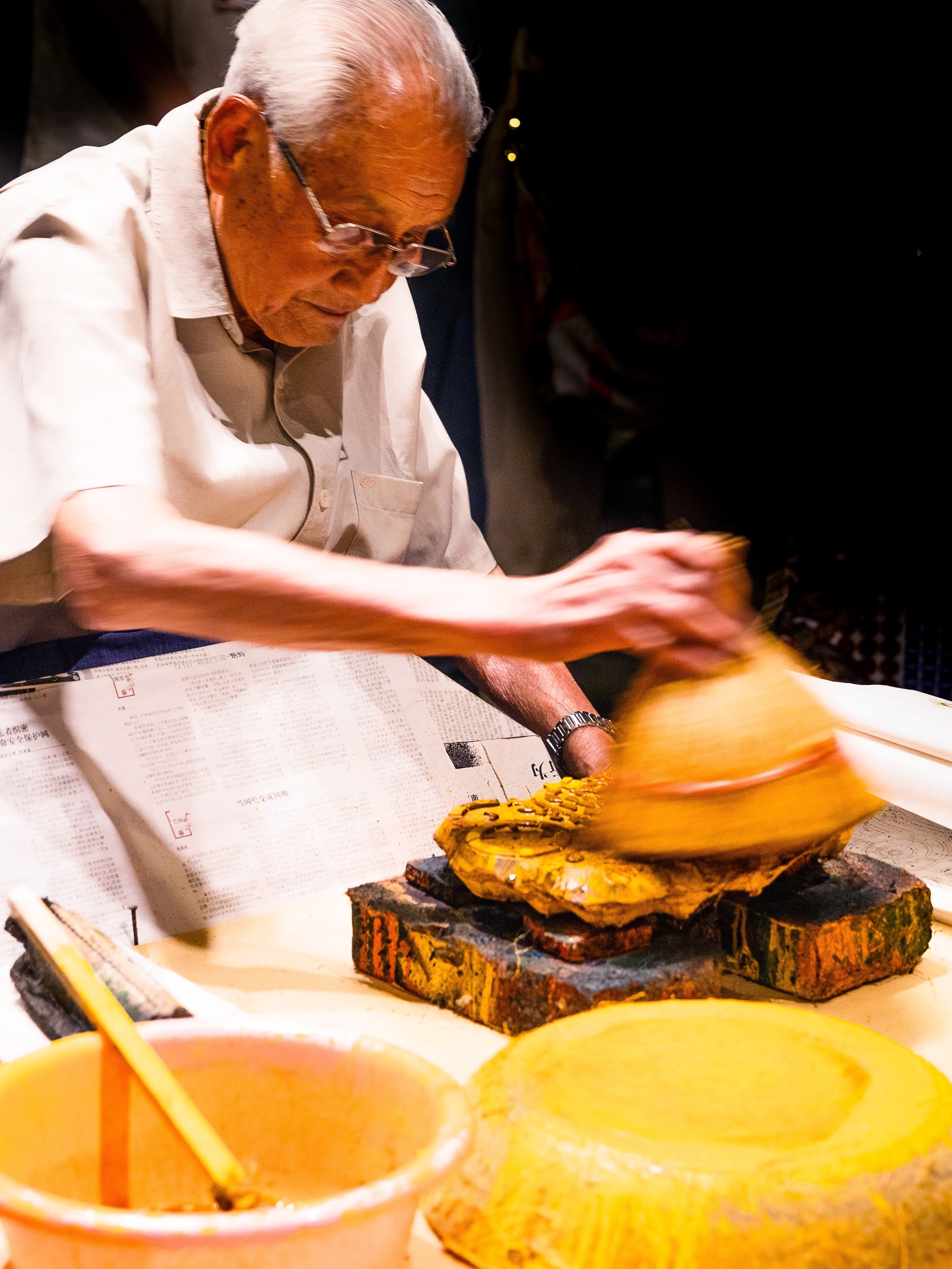 ▲一小团色彩鲜艳的面在手中揉捏、雕刻,一个气宇轩昂的面塑作品《孙悟空》就诞生了。 原和平 摄